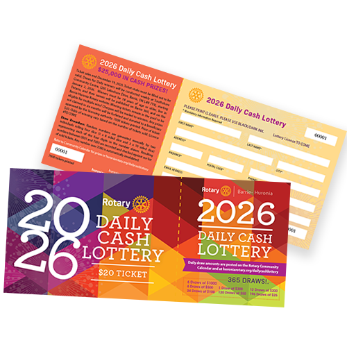 Ticket sales end December 19, 2025. Ticket stubs must be filled out to be valid. Draws for Daily winners will be conducted weekly at Southshore Community Centre, (205 Lakeshore Drive, Barrie, ON L4N 7Y9), starting January 2, 2026. Winners must be 18 years of age or older, live in Ontario, and their names will be published on Barrie 360, and on the Barrie-Huronia Rotary website. Winning tickets remain in the pool to be eligible for multiple wins! Cheques will be mailed to winners. Any prizes not claimed in six months will be forfeited and donated to a beneficiary approved by the licensing authority. 7000 tickets printed. Price of ticket: $20. Odds of winning vary based on the number of tickets sold.